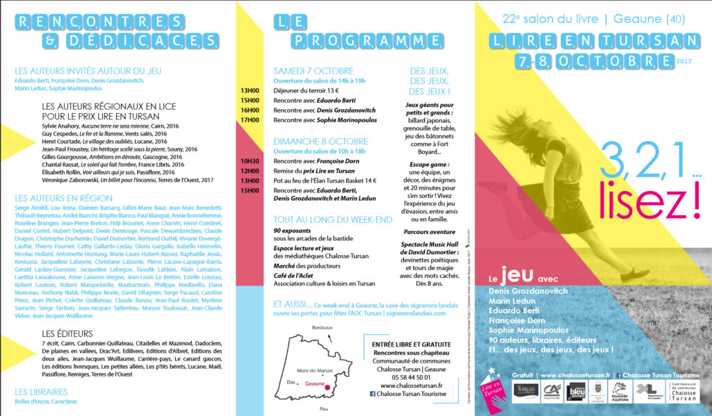 Ce sera la première fois que je me rends à Lons. C’est un petit salon du livre qui a lieu en plein air. Si la météo n’est pas favorable l’événement est annulé. Aussi, croisons les doigts pour que la Balade Littéraire soit maintenue ! On se donne donc rendez-vous le 10 Septembre 2023 à partir de 10h00 en extérieur pour un parcours reliant la Plaine des Sports de Lons à la Médiathèque, en passant par l’Espace James Chambaud.